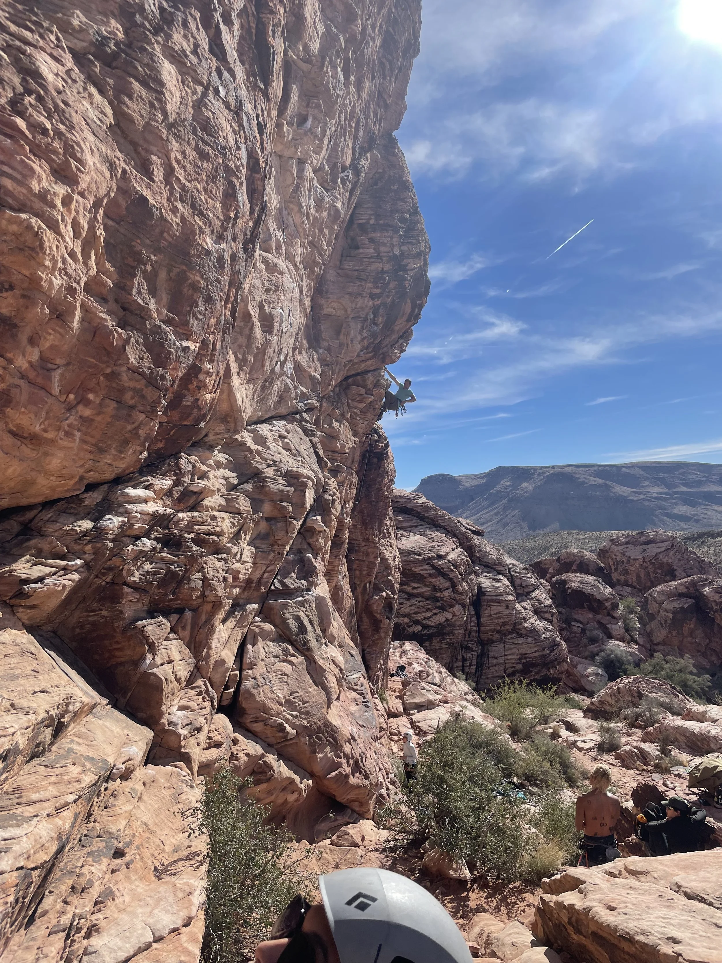 Drew onsiting “Saguaro” - 11b sport, Red Rocks, Nevada.